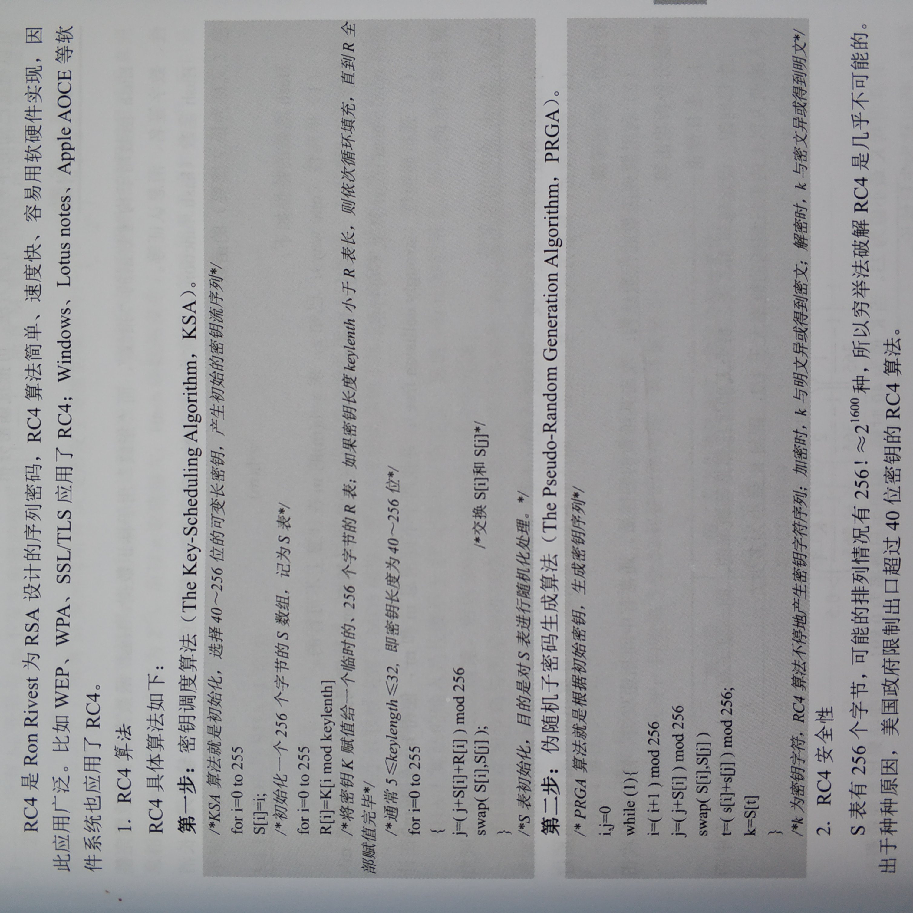 - RC4 包含两个算法:密钥调度算法(KSA)和伪随机生成算法(PRGA)