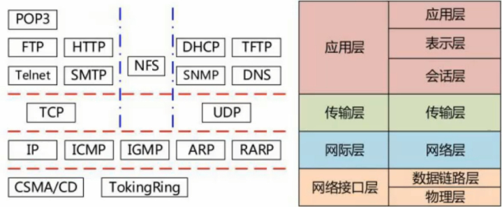 | 层次 | 名称 | 主要功能 | 主要设备及协议 | | ---- | ---------- | ---------------------------------- | ---------------------------------------------------- | | 7 | 应用层 | 实现具体的应用功能 | POP3、FTP、HTTP、Telnet、SMTP、DHCP、TFTP、SNMP、DNS | | 6 | 表示层 | 数据的格式与表达、加密、压缩 | | | 5 | 会话层 | 建立、管理和终止会话 | | | 4 | 传输层 | 端到端的连接 | TCP、UDP | | 3 | 网络层 | 分组传输和路由选择 | 三层交换机、路由器、ARP、RARP、IP、ICMP、IGMP | | 2 | 数据链路层 | 传送以帧为单位的信息、保证数据正确 | 网桥、交换机、网卡、PPTP、L2TP、SLIP、PPP | | 1 | 物理层 | 二进制传输 | 中继器、集线器 |