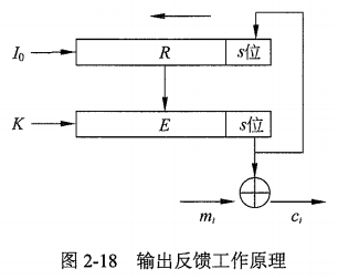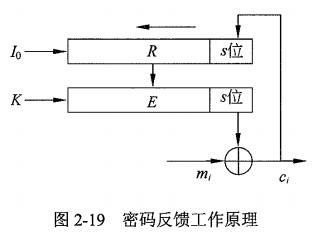 - 利用分组算法 E(如DES、AES、SM4)加密移位寄存器 R 中的内容为密文,并 “选取最右边的 S 位” 作为输出,与明文 m~i~ 异或得到 C~i~ 。
