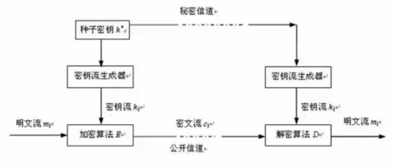 - 序列密码又称流密码,原理是明文流与密钥流按顺序逐比特进行异或运算,从而产生密文流。